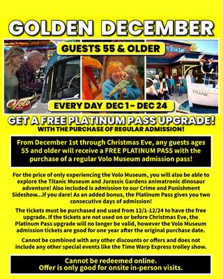 From December 1st through Christmas Eve, any guests ages 55 and older will receive a FREE Platinum Pass with the purchase of a regular Volo Museum admission pass. For the price of only experiencing the Volo Museum, guests will also be able to explore the Titanic Museum and Jurassic Gardens animatronic dinosaur adventure, plus enjoy admission to the Crime and Punishment Sideshow—if they dare. As an added bonus, the Platinum Pass provides two consecutive days of admission.Tickets must be purchased and used between 12/1 and 12/24 to receive the free upgrade. If tickets are not used on or before Christmas Eve, the Platinum Pass upgrade will no longer be valid; however, Volo Museum admission tickets remain valid for one year from the original purchase date.